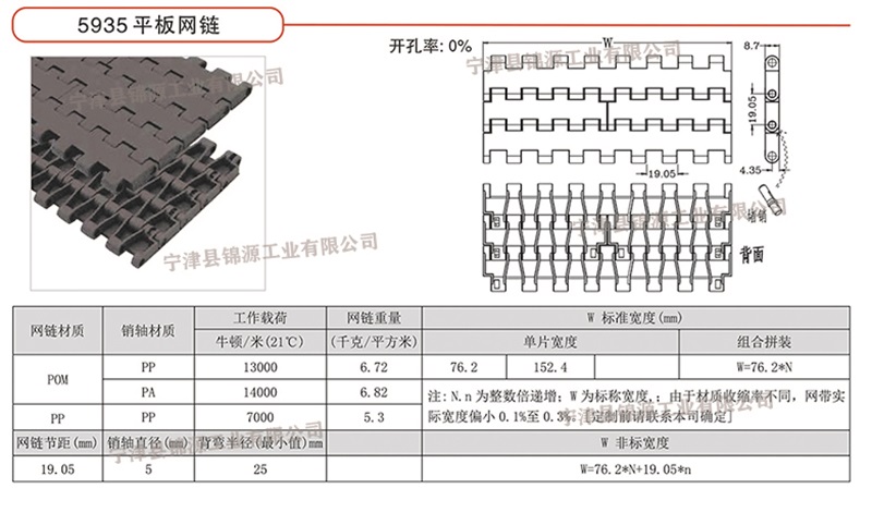 塑料網(wǎng)帶由鏈輪驅(qū)動,網(wǎng)帶節(jié)距主要有12.7mm、15.2mm、19.05mm、25.4mm、27.2mm、38.1mm、50.8mm、57.15mm,開孔率2%-48%